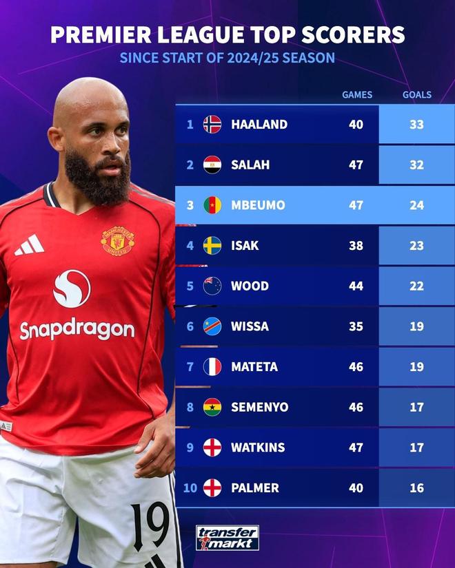 3. 姆伯莫(布伦特福德/曼联) 24球(47场)